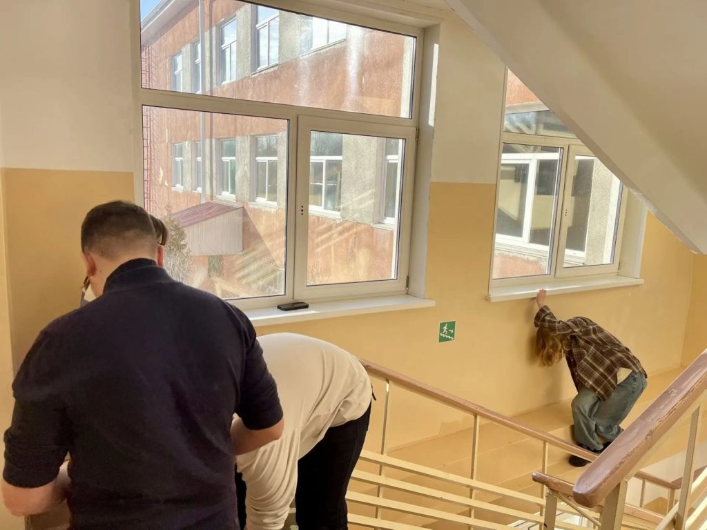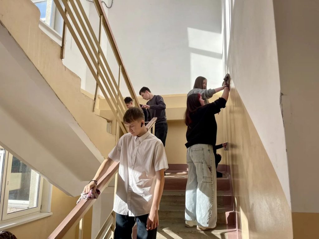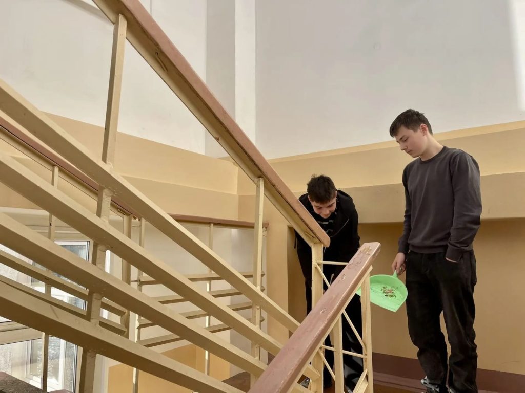 25 декабря проходила генеральная уборка по школе. Ученики 9 «А» класса приводили в порядок лестницу (мыли подоконники, стены, перила).