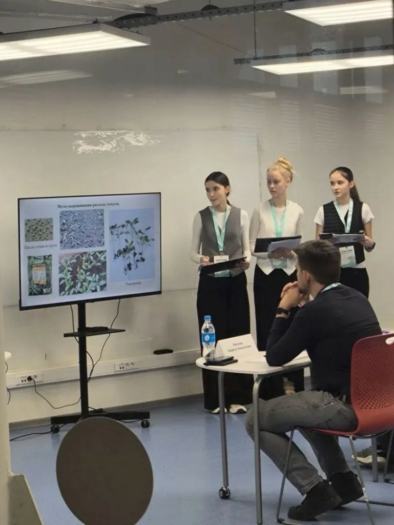 Команда «Трилистник» (ученицы 8 «Б» класса школы «Сириус»: Вставская Милана, Ионова Елизавета и Ионова Камилла) представила исследовательский проект «Влияние стимуляторов роста на рассаду томатов сорта „Баяя“».