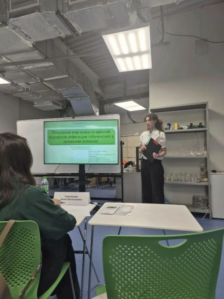 Сероус Мария, ученица 10 «А» класса с естественно‑научным профилем обучения, представила работу на тему «Получение агар‑агара из морской водоросли анфельции тобучинской».