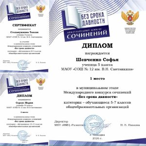 Учащиеся нашей школы приняли участие в муниципальном этапе Всероссийского конкурса сочинений «Без срока давности», направленного на сохранение исторической памяти о Великой Победе в Великой Отечественной войне. Благодарим участников за интерес к этой теме и творческий подход! Поздравляем победителя Шевченко Софью (возрастная группа 5-7 класс), призера Сероус Марию (возрастная группа 10-11 класс), участника Степанушкину Таисию (возрастная группа 8-9 класс).