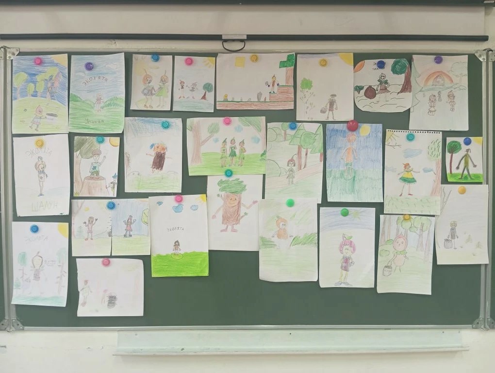Выставка рисунков в 4 «Г» классе «Эколята-защитники природы». Ребята нарисовали четырёх персонажей: «малышей-желудей» и их подружку Елочку, которые помогают детям изучать природу.
