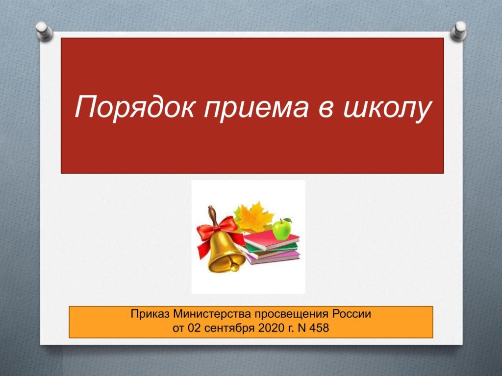 - Приказ Министерства просвещения Российской Федерации от 02.09.2020 № 458 «Об утверждении Порядка приема на обучение по образовательным программам начального общего, основного общего и среднего общего образования»
