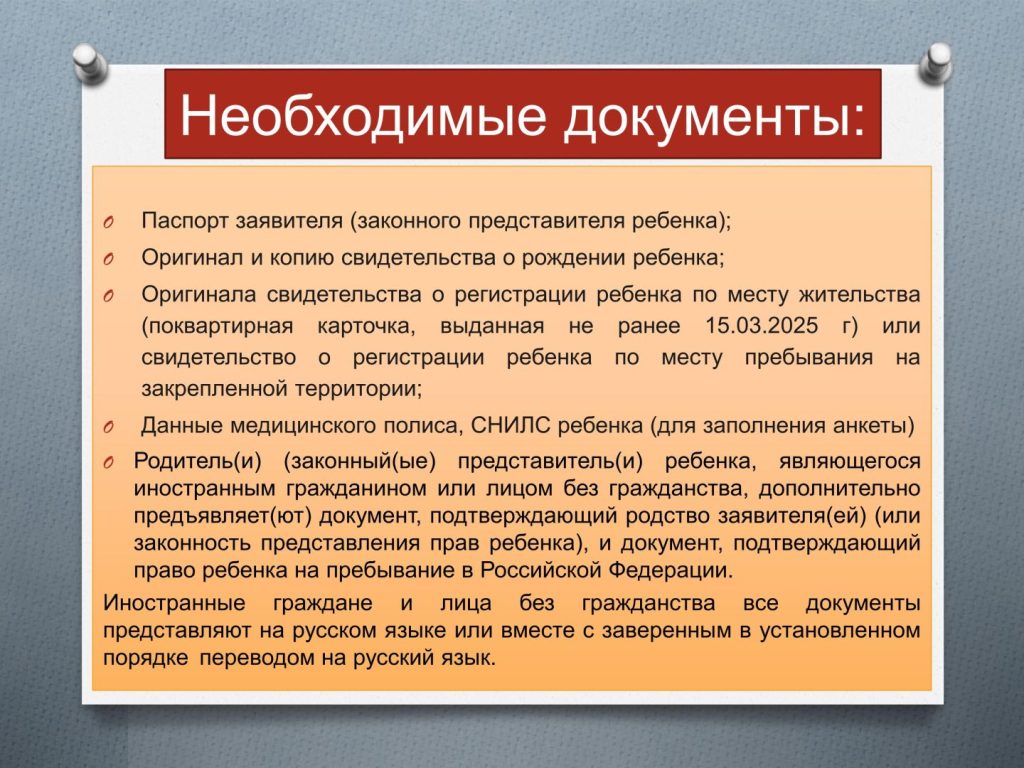 - Копии медицинского полиса, СНИЛС ребенка (для заполнения анкеты);
